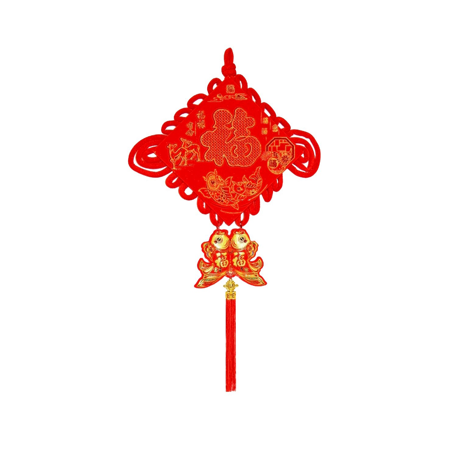 Традиционный китайский узел в форме ромба с символичным дизайном. Яркое сочетание красного бархата и золотых элементов создает эффектный акцент в интерьере.