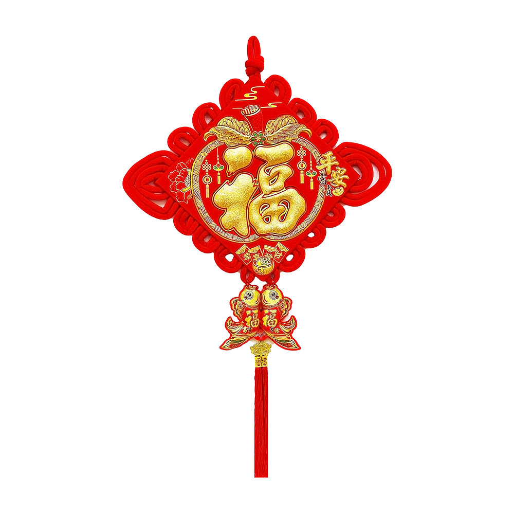 Традиционный китайский узел в форме ромба с символичным дизайном. Яркое сочетание красного бархата и золотых элементов создает эффектный акцент в интерьере.