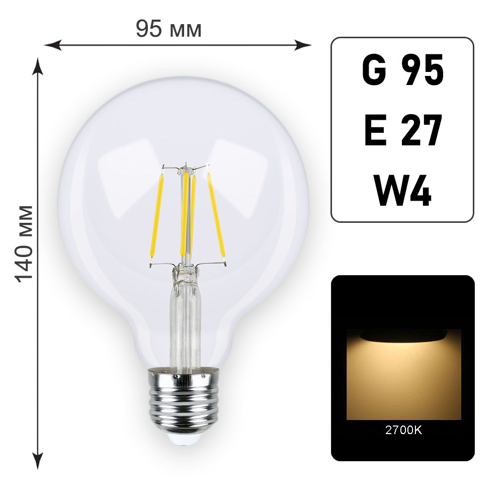 Лампа светодиодная G95 E27 W4 винтажная лампа с теплым светом 2700K. Мощность 4 Вт, что заменяет по способности освещать – традиционные лампы 20Вт. Винтажная лампа предназначена для установки в декорации и гирлянды, освещения баров и ресторанов. Длительный срок службы – до 25 тысяч часов. Угол освещения: 360 °. Может устанавливаться как внутри, так и снаружи помещений.