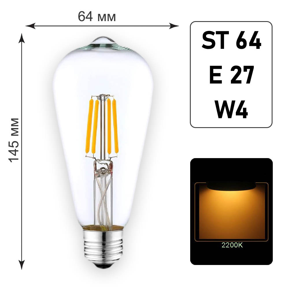 Лампа светодиодная ST64 E27 W4 – источник света с интенсивностью 2200K и с винтажной формой. Может устанавливаться в осветительных приборах кафе и ресторанов, магазинов и холлов, в гирляндах и стендах. Устанавливается в патроны стандарта E27. Не содержит ртути и свинца, экологичные и безопасные. Характеризуется длительным сроком службы – 20 000 часов