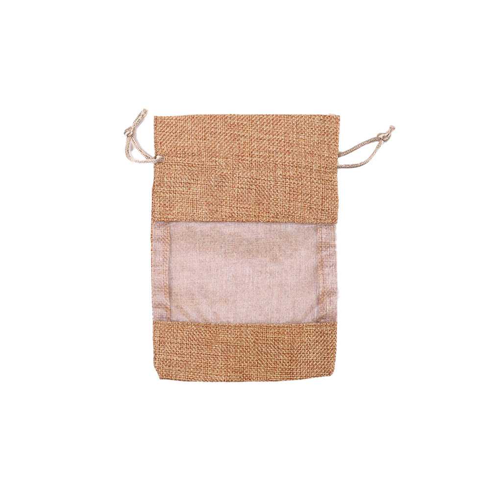 Декоративный мешочек с оригинальным дизайном: верх и дно выполнены из плотной мешковины, а центральная часть — из прозрачной органзы, благодаря чему содержимое хорошо видно со всех сторон. Такое сочетание материалов придаёт упаковке естественный, но при этом лёгкий и изящный вид.