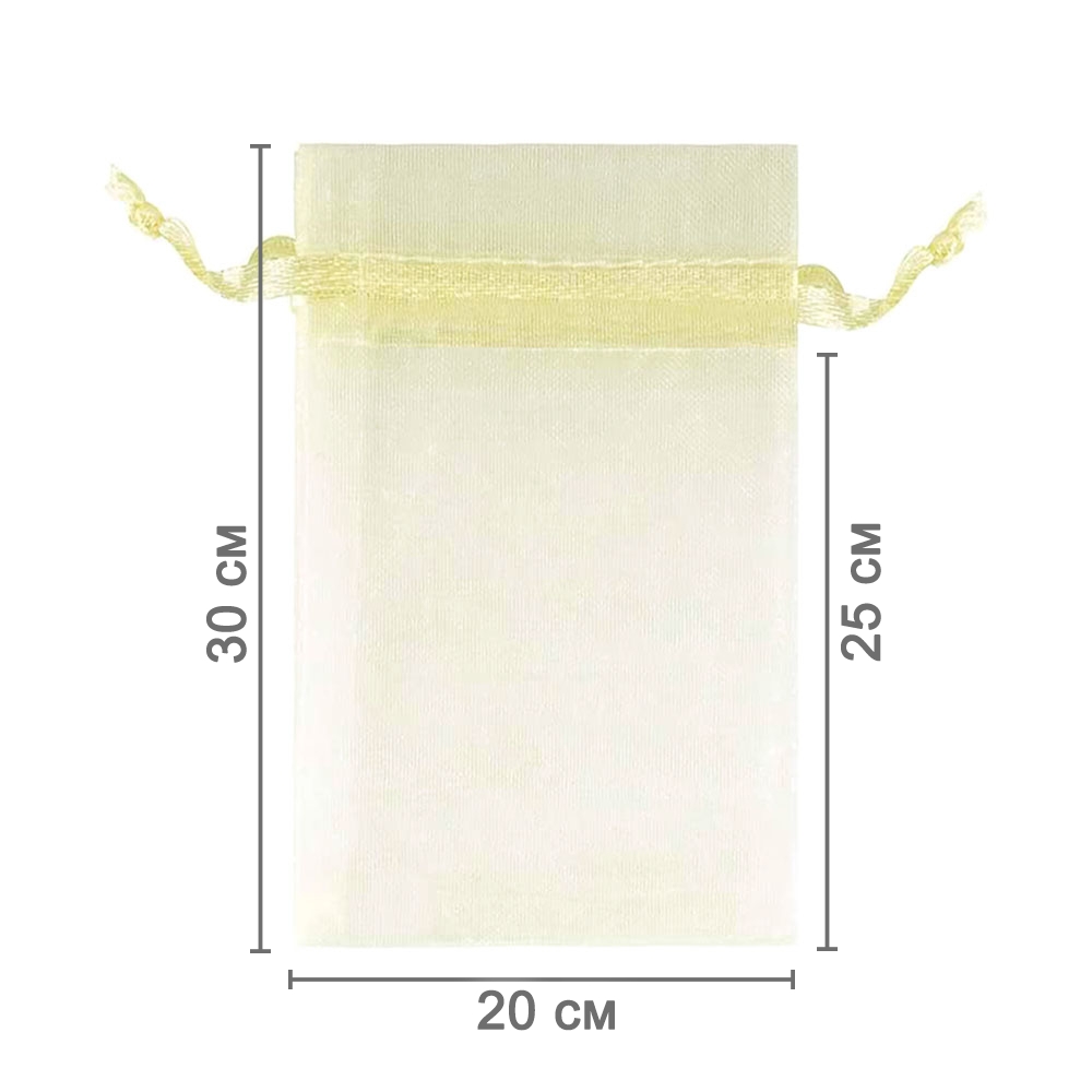 Мешочек из органзы 20 х 30 см — стильный аксессуар для упаковки средних и крупных предметов. Полупрозрачная ткань подчёркивает содержимое и придаёт аккуратный вид.