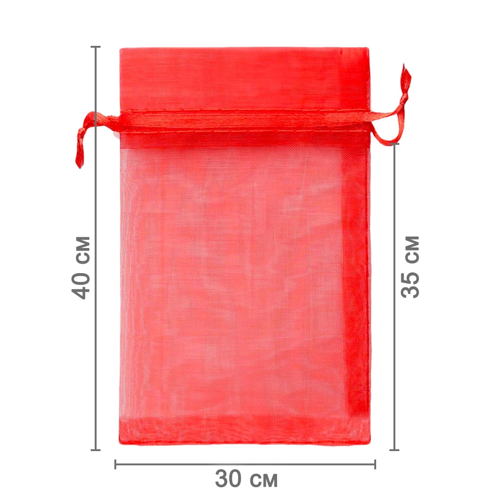 Мешочек из органзы 30 х 40 см — практичный аксессуар для упаковки крупных подарков и хранения предметов. Полупрозрачная ткань подчёркивает содержимое и придаёт праздничный вид.