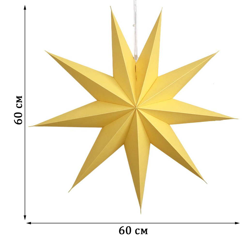 Объёмная девятиконечная звезда 60 см — декоративный элемент для интерьера и праздничного оформления. Лёгкая интерьерная звезда из картона хорошо держит форму и создаёт выразительный объём. Поставляется в сложенном виде, в комплекте шнур для фиксации объёма и подвеса.
